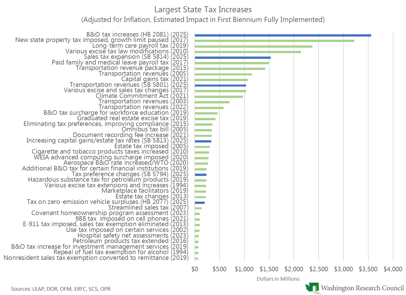 ESHB 2081, which both permanently increases business and occupation (B&O) tax rates and imposes a temporary tax surcharge on income over $250 million, is the largest tax increase going back over 30 years at least. (The taxes adopted this year are in blue in the chart.)