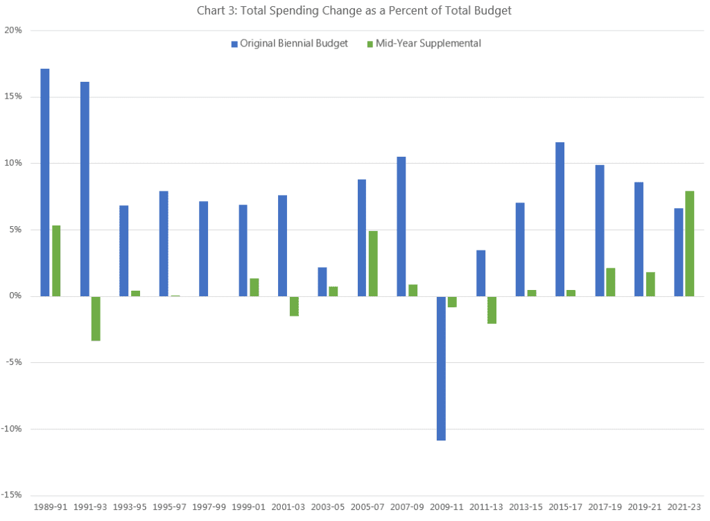 Of course, over time the budget has grown substantially. In the original 1989–91 budget, general fund–state appropriations totaled $12.516 billion. In the 2022 supplemental, NGFO appropriations total $64.138 billion. Looking at the budget change as a share of total appropriations in a biennium, the 2022 supplemental change is still larger than any other supplemental and is larger than eight original biennial budgets (out of 16). (See chart 3.)