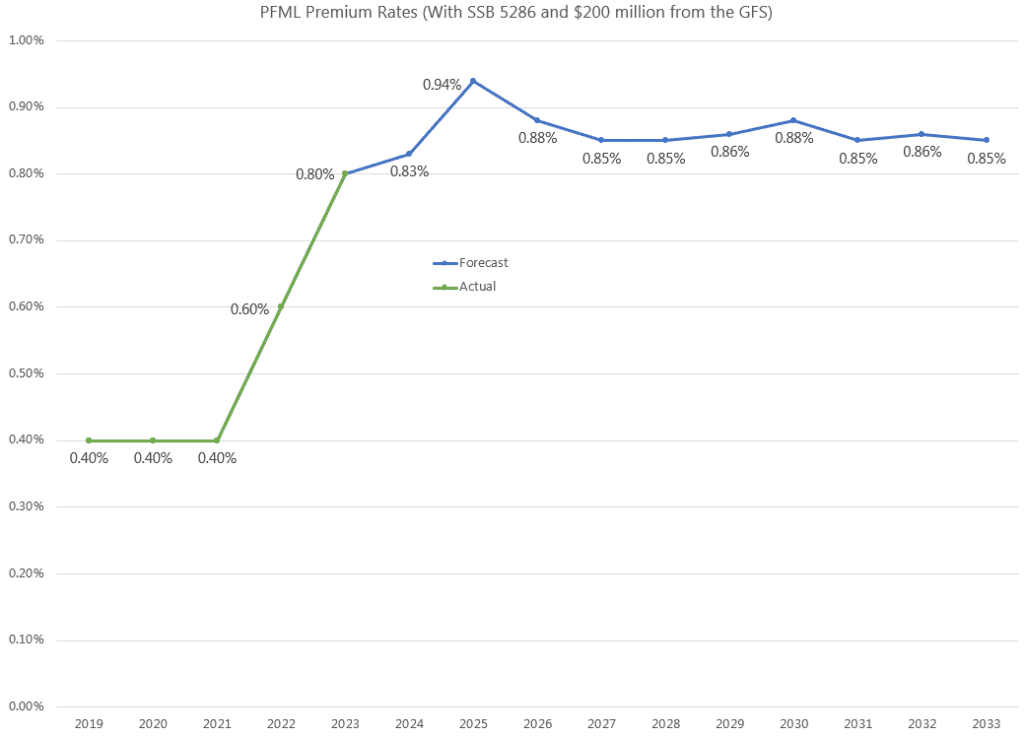 The 2023 supplemental, as passed by the Legislature, reduces the $350 million to $200 million and converts it to a direct appropriation. This means that the $200 million will be used to seed the PFML reserve (after covering the account deficit at the end of the biennium). Consequently, according to estimates the Employment Security Department provided on April 7, the PFML premium rate is forecasted to increase to 0.83% in 2024.