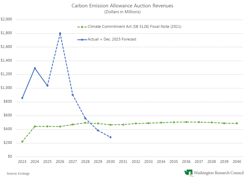 Indeed, given the Department of Ecology’s December 2025 forecast of carbon emission allowance auction revenues, using the CCA for the WFTC would not be an option after 2025–27.