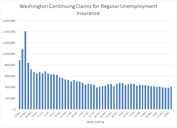 ESD reported a total of 26,693 initial claims for unemployment insurance during the week ending May 8. Of this total, 16,605 initial claims were filed under the regular state unemployment insurance program; 2,485 claims were under the federal pandemic unemployment assistance program, which covers self-employed persons, independent contractors and part-time workers; and 7,603 claims were filed under the federal pandemic unemployment compensation program, which adds 13 weeks to the maximum term of benefits.