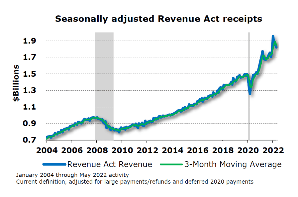Here is a chart showing seasonally adjusted Revenue Act receipts since 2004: