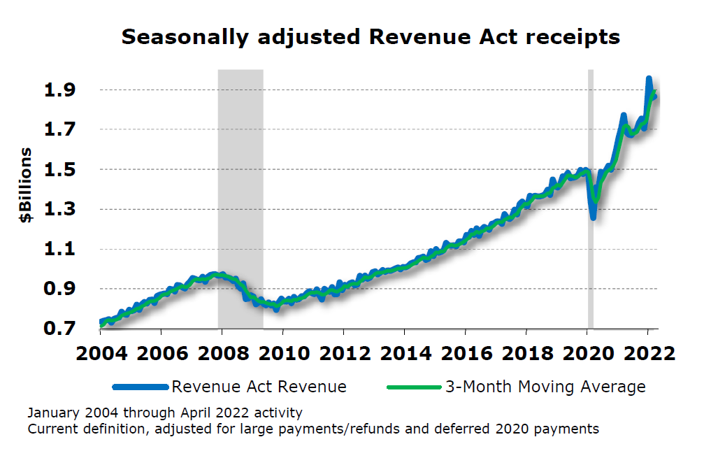 Here is a chart showing seasonally adjusted Revenue Act receipts since 2004: