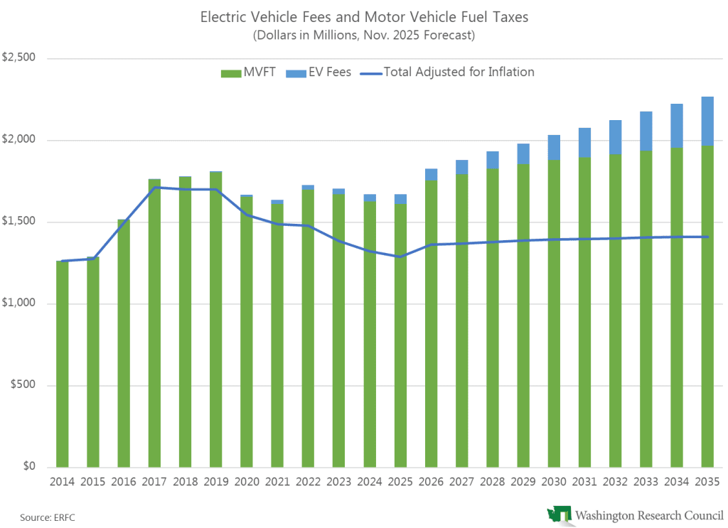 Although some of the decline in inflation-adjusted gas tax revenues will be offset by increases in electric vehicle collections, their combined revenues are expected to increase by just 3.4% from 2026 to 2035.
