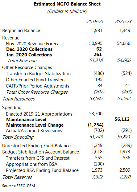 The balance sheet below includes these higher collections. The maintenance level estimates are from Gov. Inslee’s budget proposal. (These are the estimated costs of continuing current services, adjusted for inflation and enrollment. The maintenance level figures will continue to be refined as the budget process goes on.) The balance sheet does not include the governor’s proposed new spending items or his proposed tax increases.
