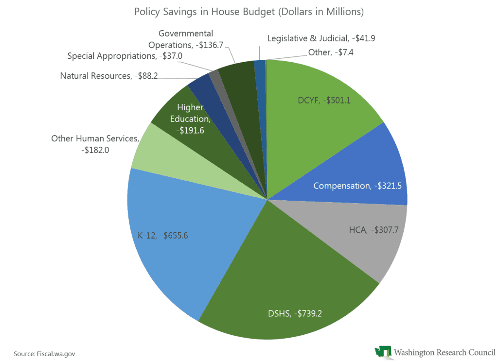 Former Gov. Inslee’s Book 1 budget proposal (which balanced within current resources) included $6.224 billion in savings. Inslee’s Book 2 budget proposal (which would have added new taxes) included $1.002 billion in savings. Gov. Ferguson endorsed the $1.002 billion in savings in Inslee’s Book 2 and suggested another $1.169 billion in savings. The Senate Ways & Means Committee Ranking Member proposed $2.753 billion in savings.