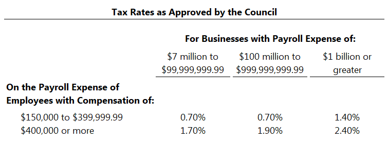 The tax is levied on “every person engaging in business in Seattle,” beginning Jan. 1, 2021. The rate of the tax depends on the total payroll expense of the business and the level of compensation per employee (see the table). No tax is owed on compensation under $150,000 a year, and no tax is owed if a business has a total payroll expense of less than $7 million. (The dollar thresholds will be adjusted for inflation annually.)