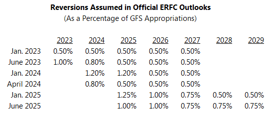 The first question staff had for the ERFC was about reversion assumptions. As the methodology memo notes, “reversions are the estimated appropriations that will be unspent and revert, making those amounts available for future appropriation.”