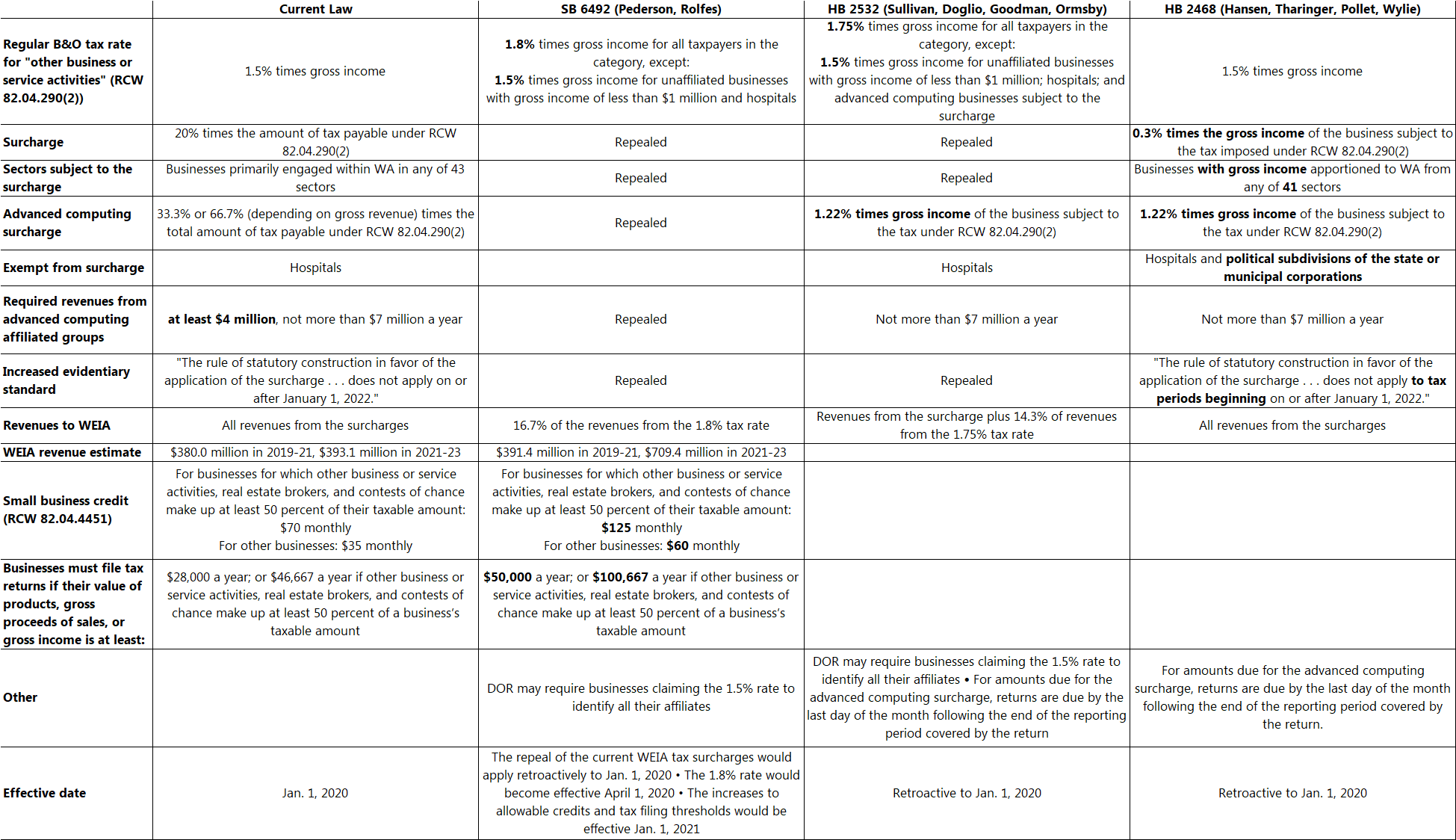 The three new bills (SB 6492, HB 2532, and HB 2468) attempt to address these issues. For example, SB 6492 would repeal the surcharges and apply a higher B&O rate across all sectors, exempting businesses with gross income less than $1 million. The table below compares the three bills to current law (click on the table for a larger version). I will update the table as more information about fiscal impacts is available.