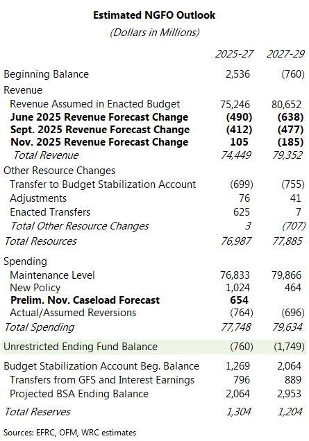 According to the Economic and Revenue Forecast Council, revenues for funds subject to the outlook (NGFO) are estimated to be $66 million lower over the outlook period than was forecasted in September. Final revenues for 2023–25 (which ended June 30) total $67.137 billion, an increase of $13.1 million compared to the September forecast. The forecast for 2025–27 increased by $105.4 million, to $74.449 billion. The forecast for 2027–29 decreased by $185.0 million, to $79.352 billion.