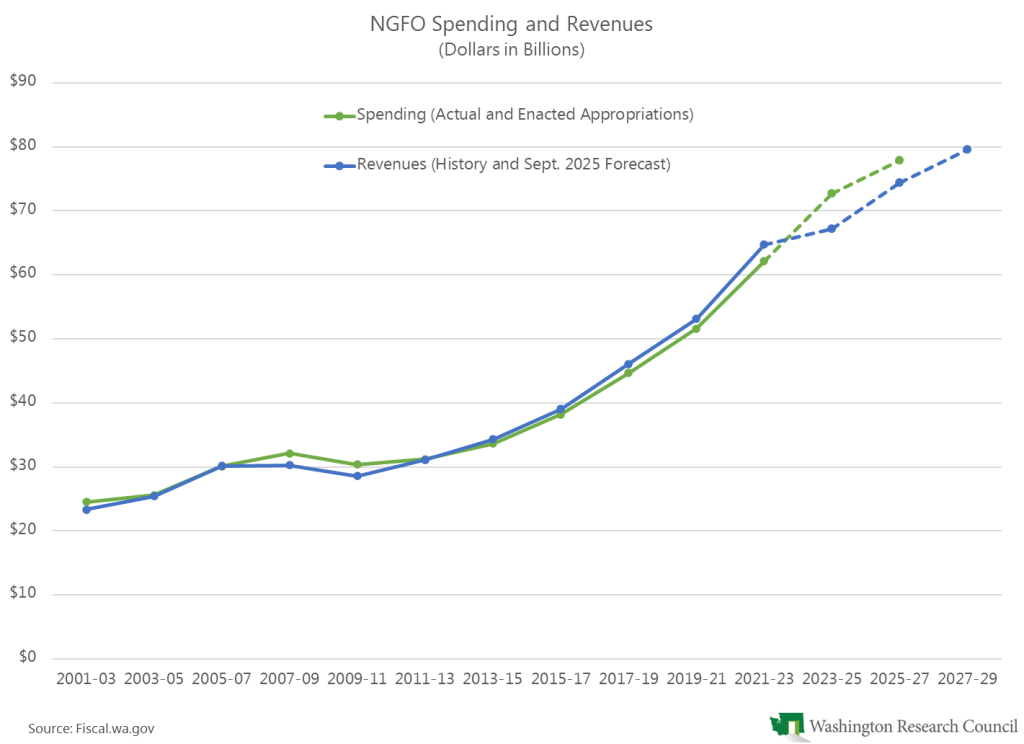Indeed, one of the reasons for the budget shortfall this year was that the state increased appropriations in 2023–25 by 15.8% when revenues were expected to grow by just 3.5%. As the chart below shows, the 2025–27 budget continued the imbalance between spending and forecasted revenues.