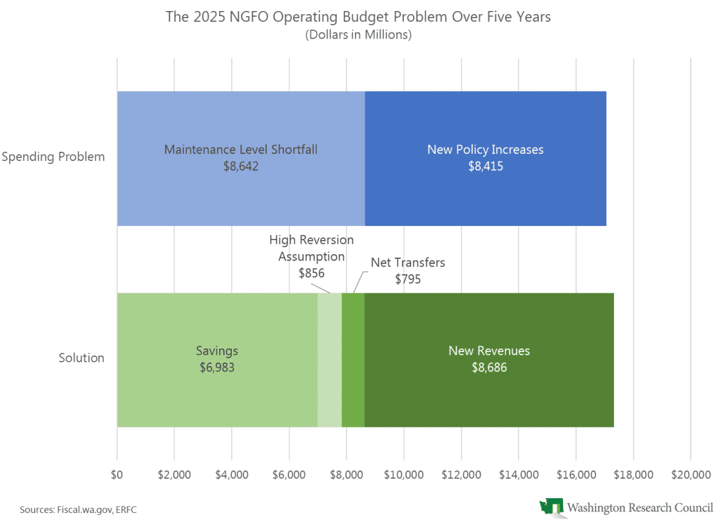 The chart below shows how the Legislature addressed the spending problem this year. First, the Legislature found $6.983 billion in savings from funds subject to the outlook (NGFO) over the five-year outlook period. (I detailed these savings items here.) Second, the Legislature assumed an unusually high level of reversions, which are appropriations that are not ultimately spent. This allowed the Legislature to increase appropriations by about $856 million while still balancing the budget. Third, transfers to the NGFO added $795 million in resources. (For example, the budget transfers $288 million from the public works assistance account to the NGFO and $110 million from the state treasurer’s service account to the NGFO.)