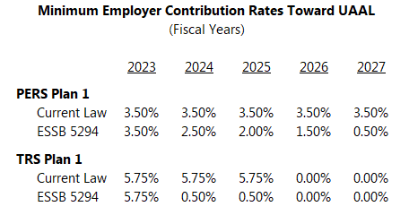 The Legislature has now passed ESSB 5294. (It has not yet been signed by Gov. Inslee.) As passed, the bill would reduce the minimum contribution rates for the UAAL beginning in FY 2024. The contribution rates would be stepped down, as shown in the table. Beginning in FY 2028, a 0.5% rate for PERS 1 and TRS 1 would be in effect only when they are less than 100% funded.