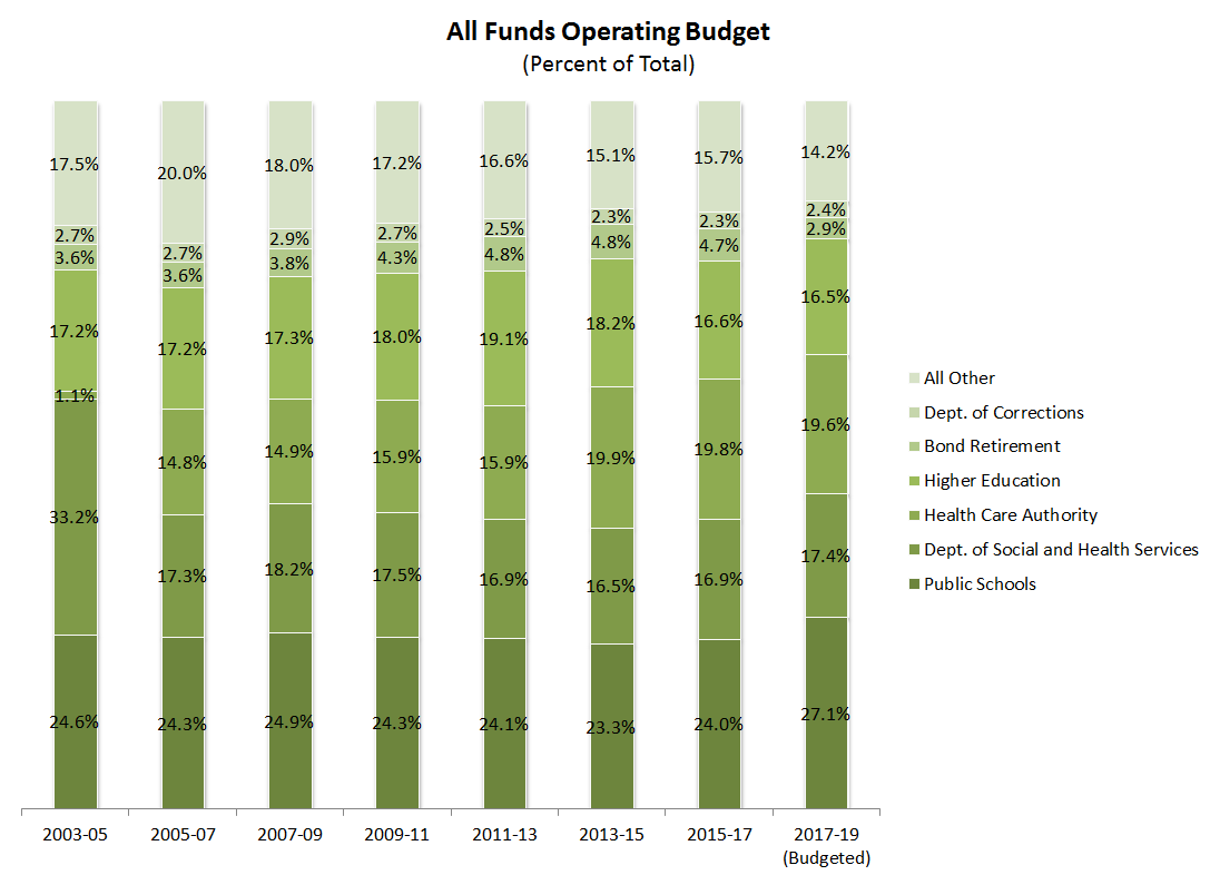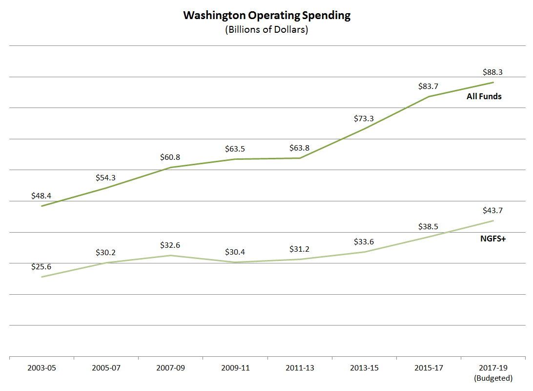 Legislative fiscal committee staffs base budget presentations on a synthetic “account” that rolls up the general fund–state (the state’s primary budget account) with the education legacy trust account and the opportunity pathways account, because they believe that it better reflects the entire budget situation. Previously called the near general fund-state plus opportunity pathways (NGFS+), it is now more simply called “funds subject to the outlook” or the near general fund-outlook (NGFO). (Under the four-year balanced budget requirement, a positive ending balance is required in the current biennium on an NGFO basis.)
