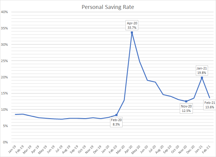 The second chart shows the personal saving rate, monthly from January 2019 through February 2021. (The saving rate is equal to the amount of personal saving divided by the amount of disposable personal income. Disposable personal income equals personal income less personal current taxes, which are mostly income taxes).