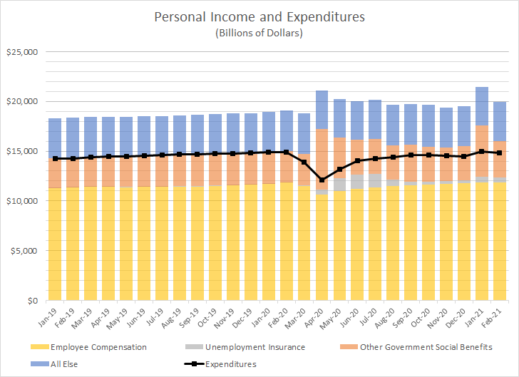 Also on the first chart, the black line shows monthly personal consumption expenditures. Again, these numbers are seasonally adjusted annual rates. Consumption expenditures in February 2021 were $149.0 billion (1.0%) less than in January.