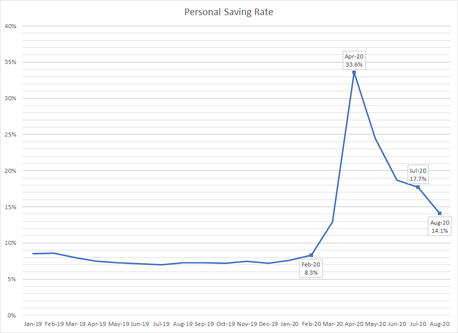 The saving rate jumped from 8.3 percent in February to an astounding 33.7 percent in April and then declined to a still quite high 14.1 percent in August. It was the 3.6 percent decline in the saving rate from July to August that allowed consumption expenditures to rise while personal income fell.