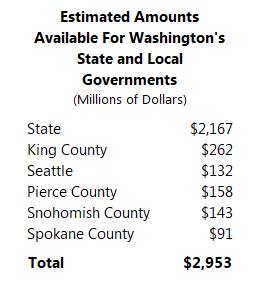 King, Pierce, Snohomish, and Spokane counties and the city of Seattle are eligible to receive funds directly from the federal government. During a Seattle City Council briefing yesterday, the City Budget Office said that they expect the city to receive $131.5 million of the $2.953 billion.