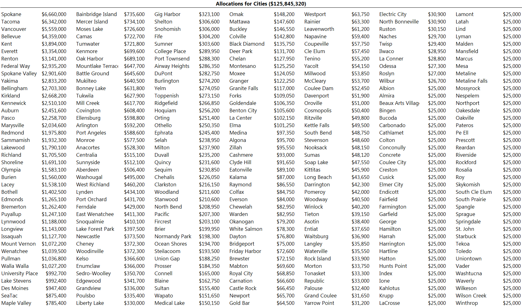 According to Commerce, the funds were allocated “based on population, COVID-19 impact and other factors.” For counties, the awards range from $250,000 for Columbia, Garfield, and Wahkiakum counties to $26.9 million for Clark County. For cities, they range from $25,000 for 70 towns to $6.7 million for Spokane. I’ve listed the awards by dollar amount below; Commerce has a list by county.