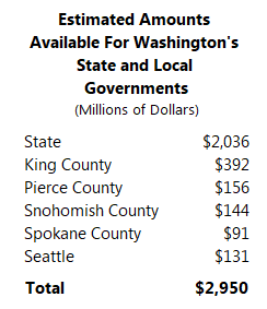 Additionally, the federal government would make direct payments to certain local governments from the amount reserved for those localities’ states. Counties and cities with populations of at least 500,000 would be eligible. In Washington, this includes King County, Pierce County, Snohomish County, Spokane County, and Seattle. The table below shows my rough calculation of how much could go to these jurisdictions under the bill.